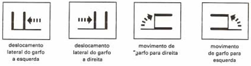 Há empilhadeiras que possuem acionamento hidráulico dos garfos no sentido horizontal e movimento giratório de 360º (graus). |