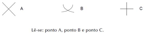 No desenho, o ponto é determinado pelo cruzamento de duas linhas. Para identificá-lo, usamos letras maiúsculas do alfabeto latino, como mostram os exemplos: