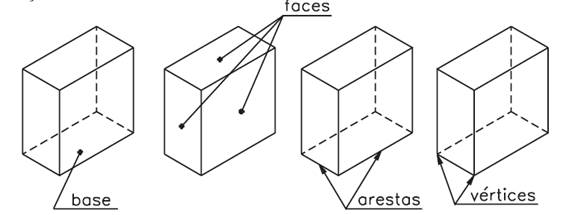 O prisma pode também ser imaginado como o resultado do deslocamento de um polígono. Ele é constituído de vários elementos. Para quem lida com desenho técnico é muito importante conhecê-los bem. Veja quais são eles nesta ilustração: