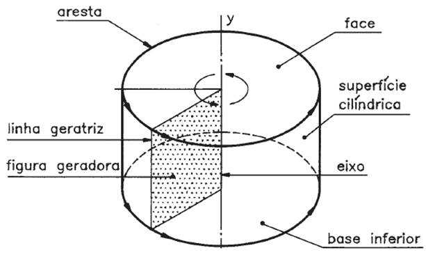No desenho, está representado apenas o contorno da superfície cilíndrica. A figura plana que forma as bases do cilindro é o círculo. Note que o encontro de cada base com a superfície cilíndrica forma as arestas.