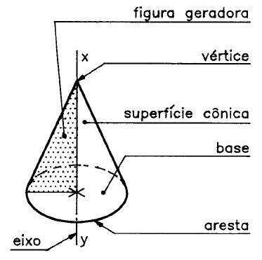 A figura plana que forma a base do cone é o círculo. O vértice é o ponto de encontro de todos os segmentos que partem do círculo. No desenho está representado apenas o contorno da superfície cônica. O encontro da superfície cônica com a base dá origem a uma aresta.
