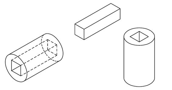 Observe a figura, notando que, para obter o cilindro vazado com um furo quadrado, foi necessário extrair um prisma quadrangular do cilindro original.